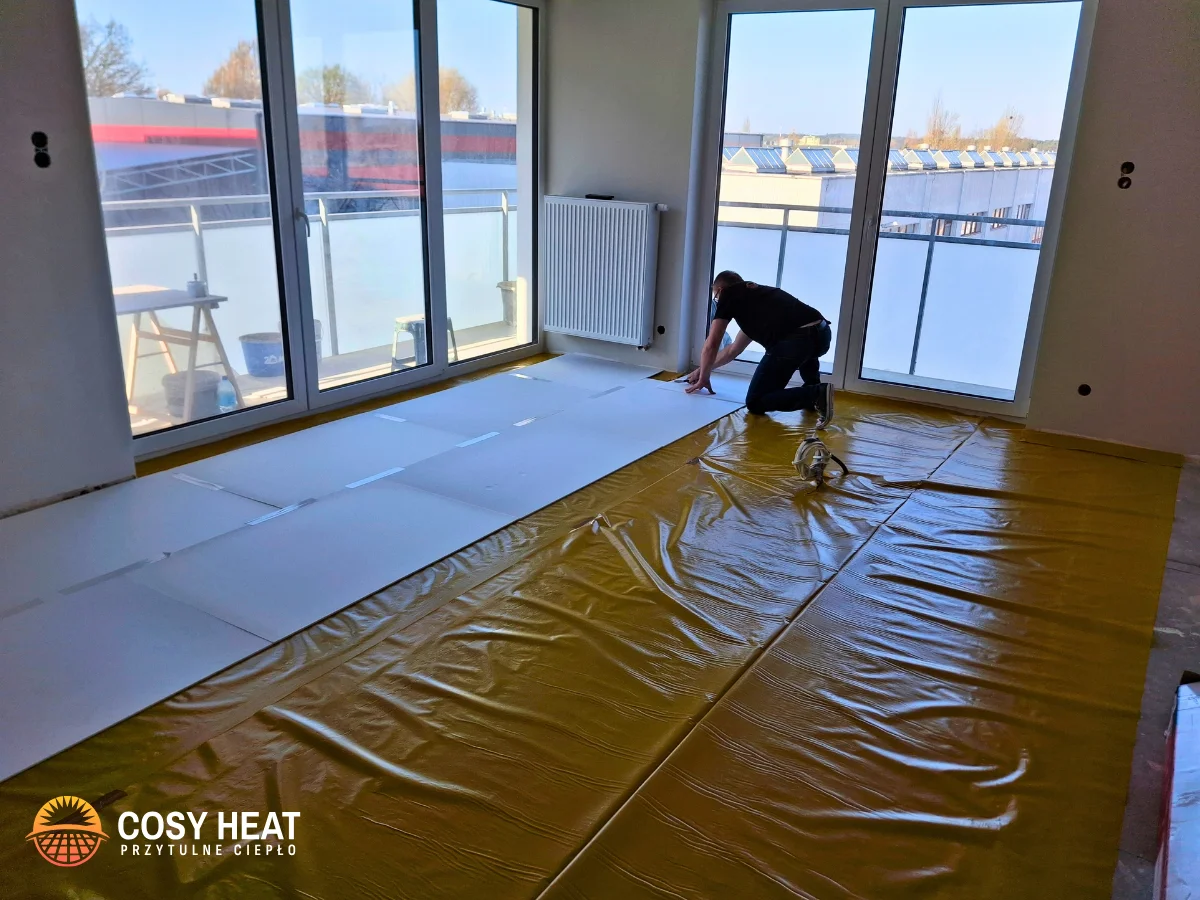 W naszym projekcie zastosowaliśmy folię grzewczą o mocy 140 W/m², zamontowaną na podkładzie izolacyjnym SUPERTHERM 6 mm i zabezpieczoną folią paroizolacyjną, co gwarantuje optymalną temperaturę w pomieszczeniach przy minimalnym zużyciu energii.