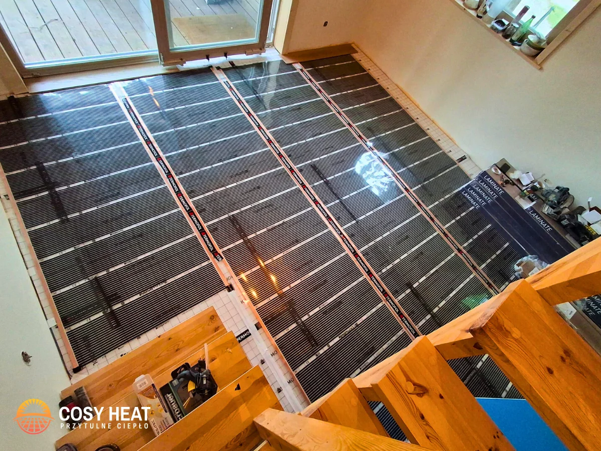 ok. 35 m² (salon + 2 pokoje na piętrze) - Moc folii grzewczej: